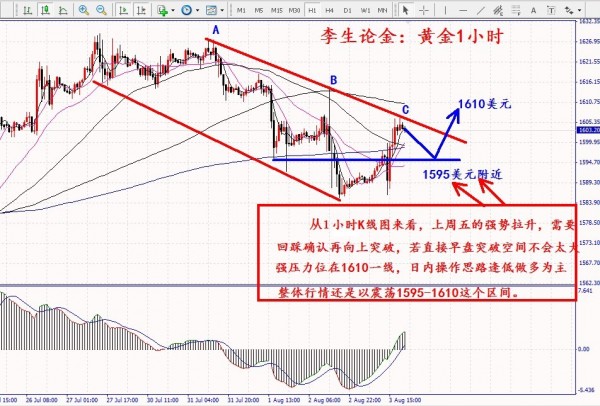 金评:上周金价自周一在1626受压后再次连续出现下跌,之前我们在金评中讲到1630多头承压,但周五日线出现了比较强势的反弹,走出吞没形态,收于日线10日均线位置,今年行情一直处于大区间震荡,单边都走的不远,美元与黄金在上周的走势上形成鲜明的对比,美元反弹后再创新低,形成跷跷板走势。在市场上,有3句至理的名言:一是市场按趋势波动,二是历史会重演,三是市场技术面包含一切。市场上最大的敌人是你自己,相信市场的力量,趋势做单,机器性的操作,不要感情做单,黄金市场是个公开,公平,公正的市场,只有你战胜了自己,才能战胜市场。经历了3个月的调整阶段,金价一直围绕在月线30日均线的位置摇摇欲坠,但却没有跌破,相信很多投资在这段时间里该知道什么叫做趋势,什么叫震荡,什么叫趋势中有震荡,震荡中有趋势,后市黄金怎么走还是市场说了算,对于很多专家仍在做前年,去年逢低做多梦似乎成为他们脑海中挥之不去的烙印,这就是李生一直讲的过去的走势悟性的是经验,没悟到的只是经历,过去不等于未来,逢低做多那是两年,三年前惯有的操作思路,从去年8月23日后金价两次上探未果,形成大双顶,一直死多的投资者或分析师在这一年的时间里掏了不少的学费,逢低做多可以,但不要一直死多。黄金目前走势还没有发生根本改变,还是在1650-1530这个区间周线三角形里面运行,没有明显的单边迹象,所以在操作上李生还是建议以日线为方向,小时线为下单依据操作,不建议盲目看多或者看空,看准当天的就行了,没有几个人把单子拿到三个月,五个月的,拿到的都是亏损扛单的一些神人而已。只要有震荡,市场中的声音就没有消停过,正是市场很多多空的意见分岐才给我们更多更好的机会,看到形形色色的声音充满市场,不乏子虚乌有,不乏推波助澜,也不乏扭曲事实,使得远离市场的本质越来越远。你管行情走到哪里,把握阶段性的获利才是重中之中,牛可以赚钱,熊可以赚钱。从周线图来看,上周周线收带下影线的阴线,周线MACD已经形成金叉,目前受阻于布林带中轨及30日均线的位置,但下方支撑1530已多次下探未果,本周暂时先看支撑1574一线,上方压力看1630,本周在此区间操作。从日从日线图看,上周先行收取四连阴,周五形成小型双底带来大反弹。目前布林带中轨在1590一线呈现较强的买盘支撑。而上方1606形成第一阻力,突破这里将再度向1620发起冲击,但1615上方将表现出较强的阻力。日内在1600附近横盘整理后日内将有望再次冲高,上探1615-1620一线。从四小时图看,上周四和周五分别试探1585得到支撑,均出现快速反弹。目前可重点关注四小时死叉运行情况,如转为金叉并穿越零轴,则将转为强势震荡格局;如先形成金叉,再转为死叉,则将刷新新低。从1小时图来看,金价回踩1600一线还将有一波上涨,不过空间应该不会太大,亚欧盘先在1600-1610区间操作。综合来看,上周呈现持续的下跌,但周五的数据报好,在利空黄金的情况下都未能出现跌幅,反而得到支撑上涨,短线有望转为阔幅震荡,1615上方表现较强阻力,1592附近呈现强劲支撑。日线先在1594-1610在此区间操作,破位后再顺跟进,周一数据方面影响不大,主要以震荡修复为主,将有望延续上周五的行情走势。