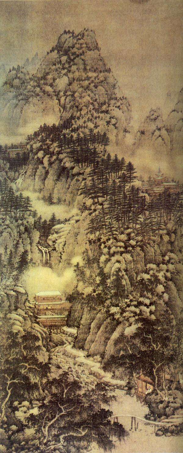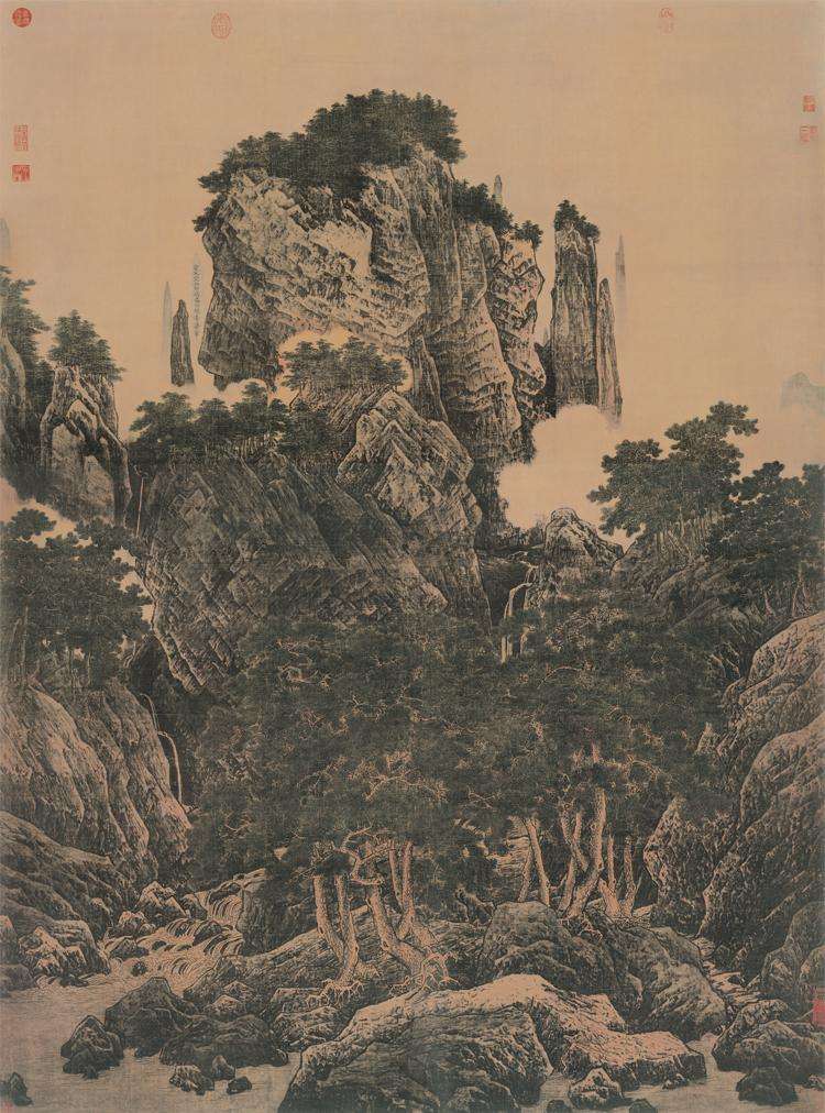 在笔法上,他融合了李成、范宽、郭熙诸家技巧,用多种皴法表现不同的石质,冈峦、峭壁,好像斧头刚刚凿过。