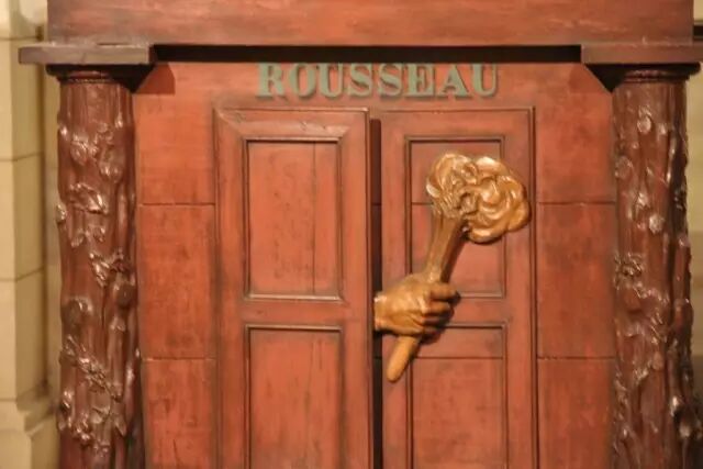 先贤祠的卢梭棺木构思精巧,棺木中伸出一只手,紧握火焰浓烈的火把,象征卢梭的思想之火点燃了法国革命