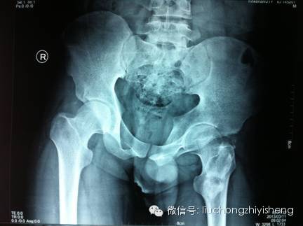 如图右侧髋关节处为臀肌挛缩术后异位骨化。