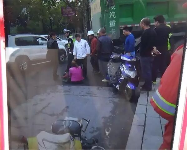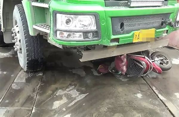 此时,交警和群众团团将黄沙车围住,车头下方压着一辆电瓶车。据目击者说,当时除了粉红外套女子,电瓶车上还有一名男子,被黄沙车拖入车轮下方……