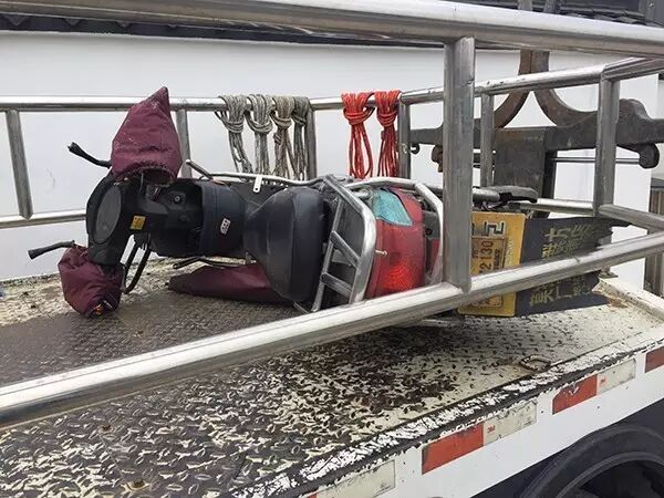 我赶到现场时,看到一辆路面清障车停在旁边,车上装着一辆电瓶车,旁边还放着一个男子的黑色帽子。