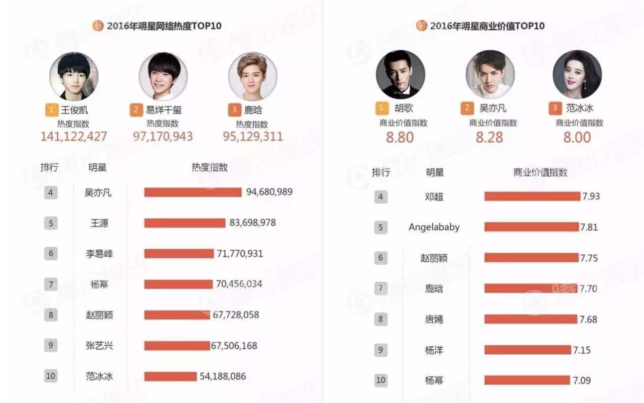 2016虽然已经成为历史,但有些话题却永远不会过时,且非常值得细说研究一番。比如媒体去年公布的一份娱乐圈调查报告,细看明星领域里,人气榜和商业价值榜的对比结果显而易见且非常有趣。