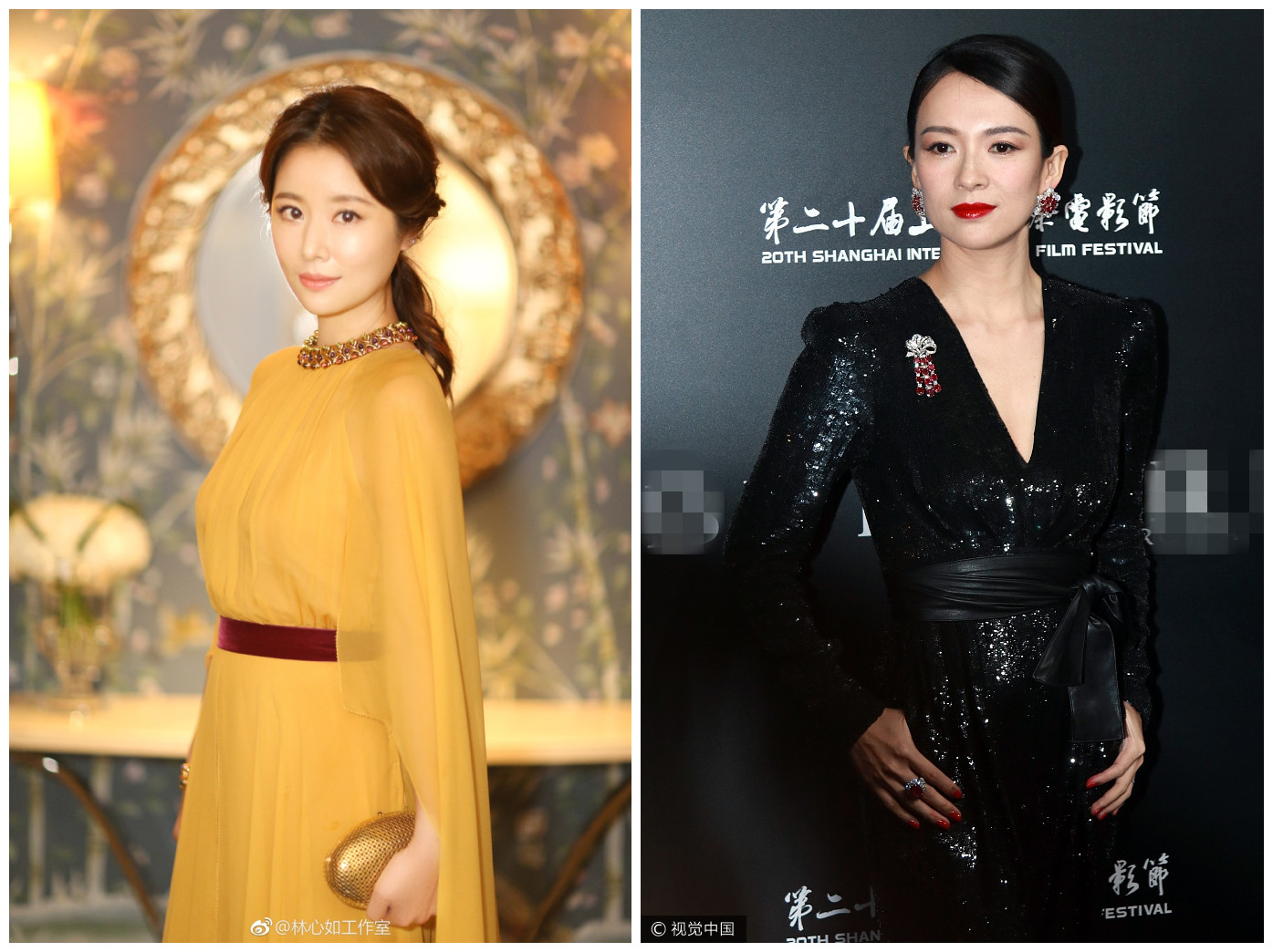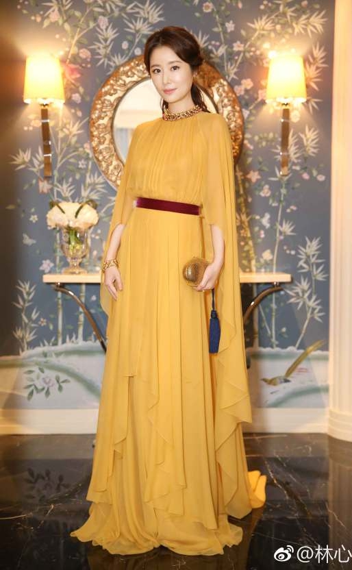 另一厢呢,则是台湾辣妈林心如。黄色礼服仙气飘飘,发型温婉,妆容清淡,依旧美如初。缺点是输在配饰,礼服红色束腰虽然强调腰身比例,但颜色与手包的深蓝色流苏颜色略冲突,整体红、黄、蓝三色好尴尬~~。