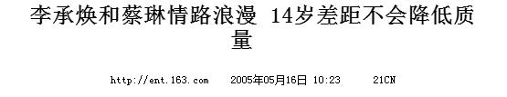 李承焕比蔡琳大14岁,而蔡琳刚刚好喜欢成熟的男性,结果两人在一见钟情下,感情发展的更加神速。2002年,已经默默地下恋情3年的李承焕公布了与蔡琳的恋情,一时间议论纷纷。但最终两人在2003年结婚了,那一年蔡琳24岁,李承焕38岁。