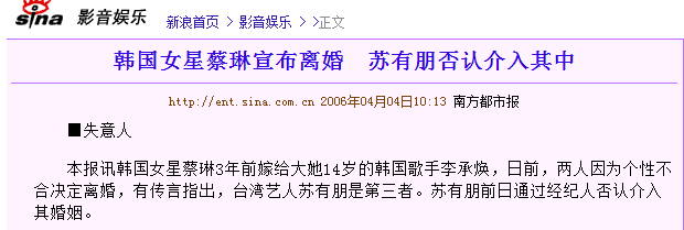 然而,2006年4月1日愚人节这天,李承焕和蔡琳正式离婚!那一年,蔡琳27岁!而至于两人离婚的原因,韩媒称是李承焕有新欢与MV女演员曝出绯闻,但关于绯闻之事,李承焕曾否认。甚至还有传是苏有朋与蔡琳有绯闻才导致离婚,但随后遭到苏有朋方面的严厉澄清。