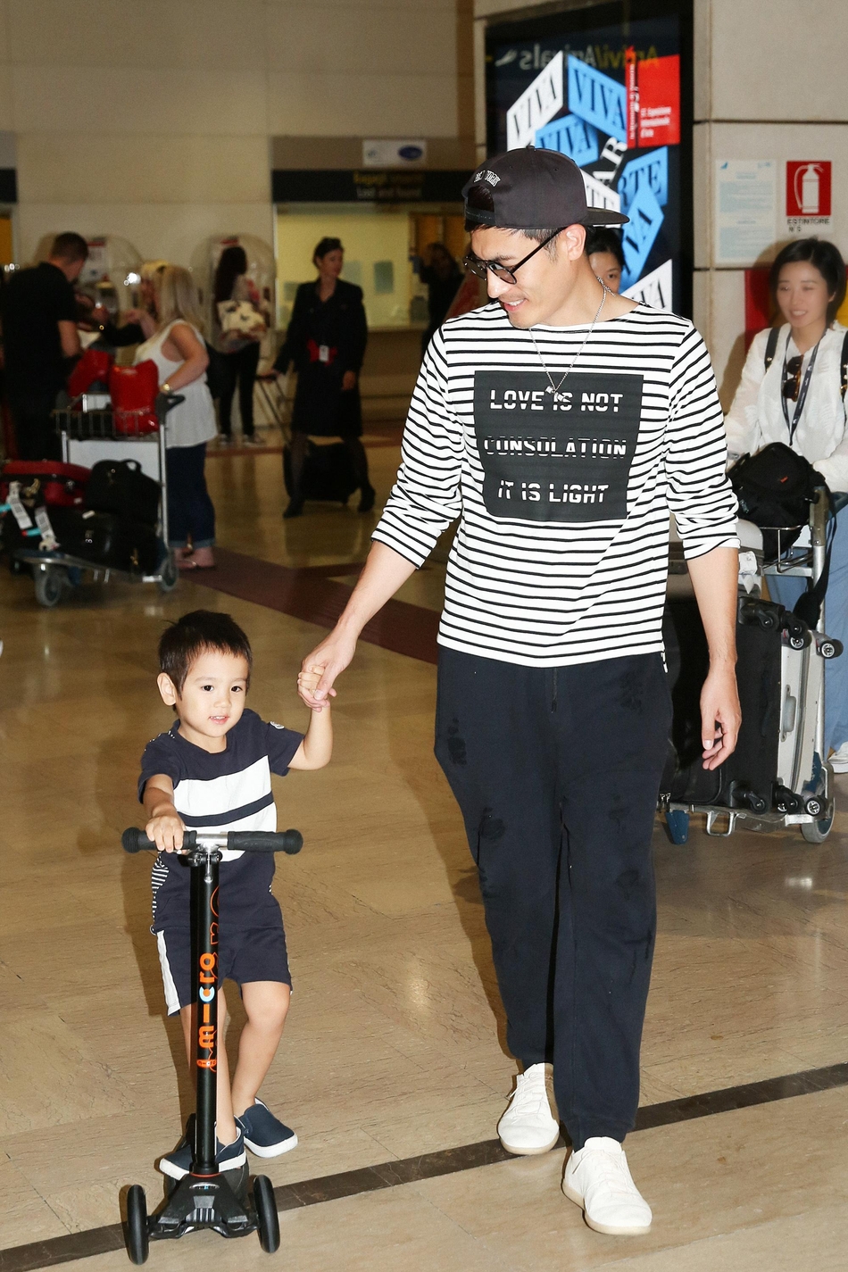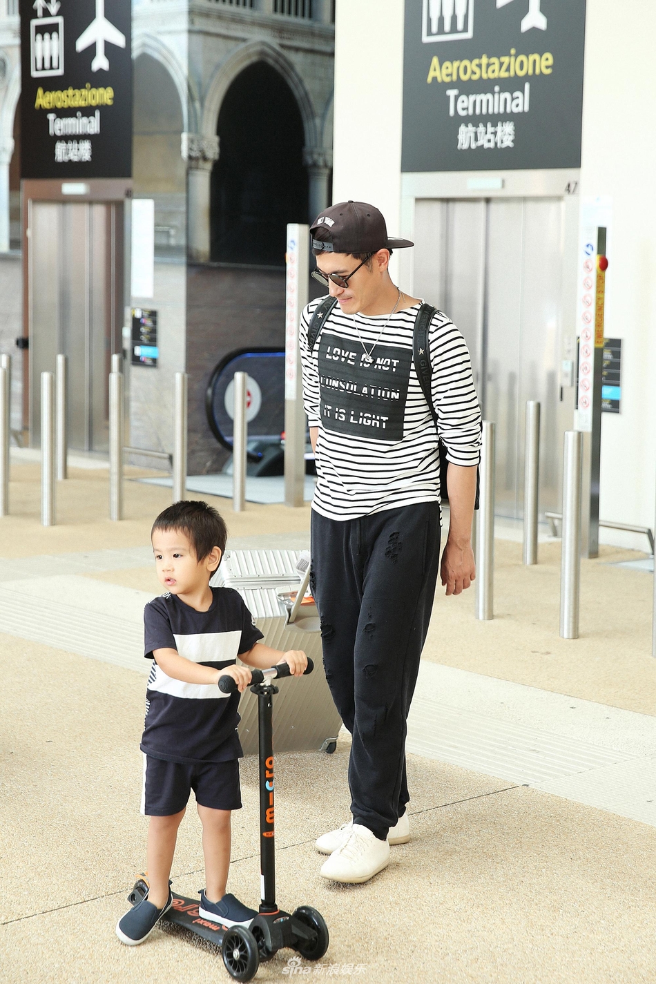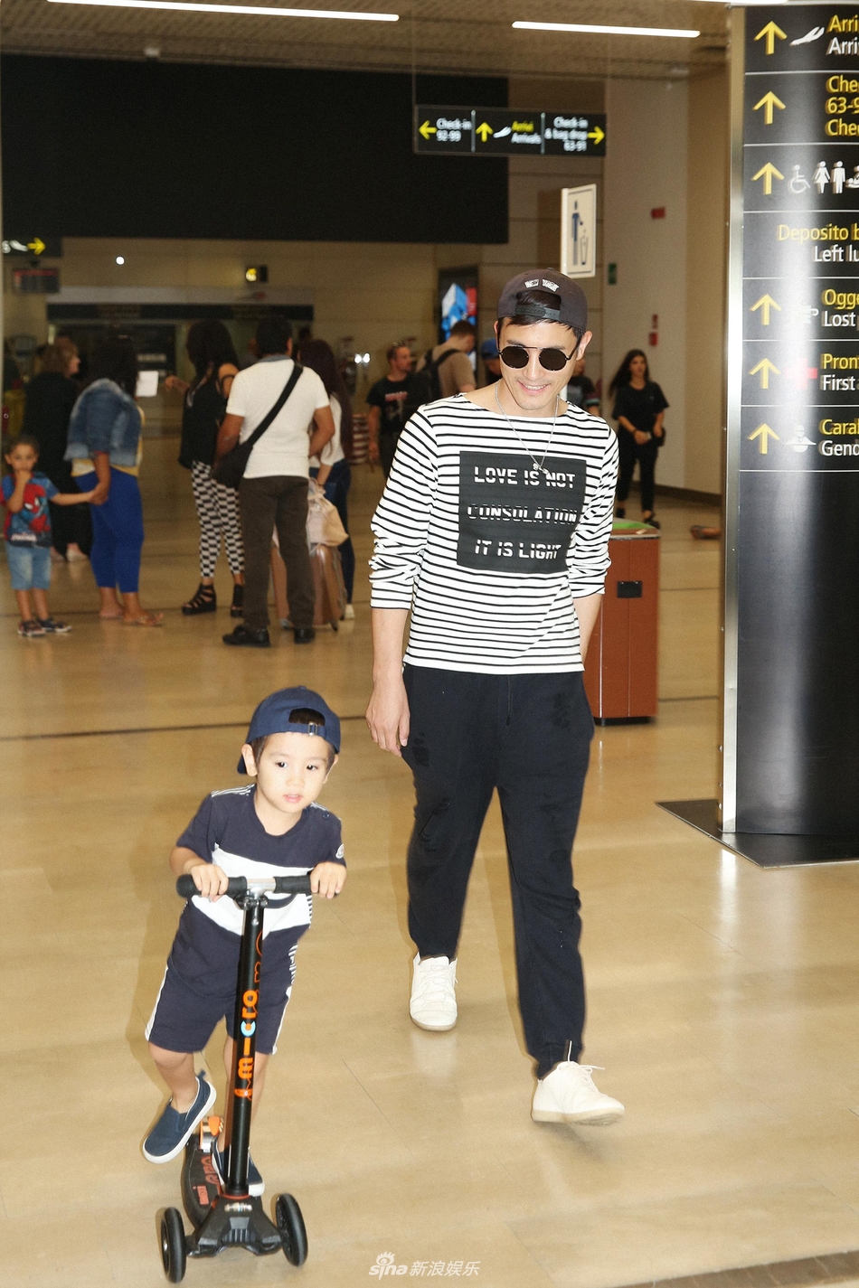 一心玩踏板车,到了国外也能很好的适用,应该是经常出国玩耍了,做惯了飞机对机场相当熟悉。