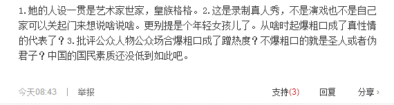 也有说她作为公众人物,不应该在节目中这样爆粗口!