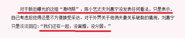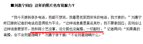 另外,最终刘惠宁也回应了妻子的绯闻!称照片没有说服力,并且表示自己和陈小艺没事,没分居也没离婚,一切都好!