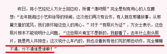 最后,还是陈小艺的经纪人出面回应,说所有的八卦都是假的,照片也不是真的!直接否认了艺人与徐昂的绯闻。