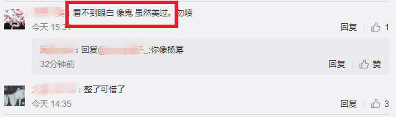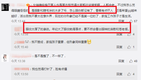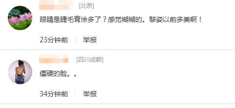 网友一针见血的指出黎姿眼睛的问题,睫毛和眼影弄得太浓了,没有眼白太吓人。