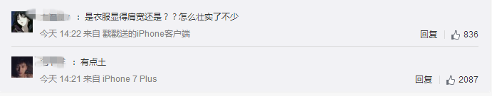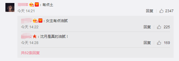 这条评论说土气的留言,共计被点赞2087个!看来还是绝大部分的网友审美保持了高度一致,给沈月的土气盖章。。。。