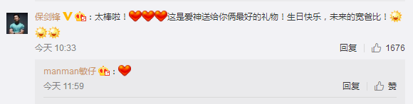 接着是男演员保剑锋,他的祝福很细致,说这是爱神送来的最好的礼物,并且祝福未来的宽爸比~
