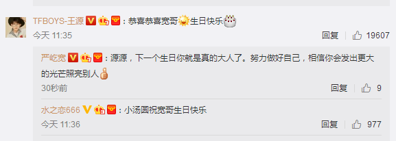 而所有的祝福中,王源小朋友的祝贺最暖心了,他先是连说了两个恭喜宽哥,最后还不忘祝福对方生日快乐,嗯,暖心可爱的王源真的招人喜欢。难怪严屹宽在评论里回复他,称呼他为源源。并且严屹宽也特别暖心的鼓励王源,让他努力做好自己,坚信自己一定会更加光亮。