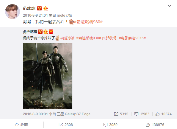 宣传期中,范冰冰也在微博上喊严屹宽为哥哥!~~