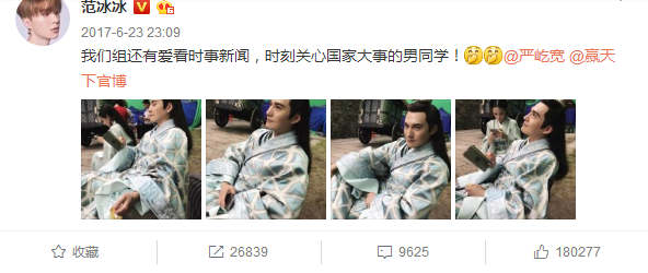 而去年合作巴清传时,范冰冰也是在微博上和严屹宽各种互动呢~并说严屹宽格外关心国家大事,言下之意是严屹宽特别老干部2333