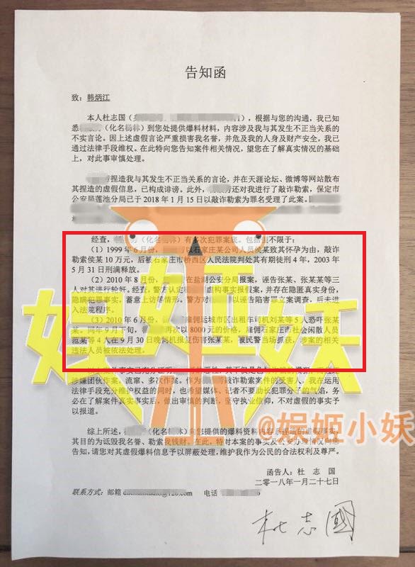 并且,在稍晚一些时候呢,杜志国方再度发了一份公告函。其中详细的说明了一些当时的情况。也包括扒皮也该女子的一些前科。从红框内可见,该女子原来分别在1999年,2000年6月和8月分别以怀孕为由敲诈勒索男方,且屡屡获刑!那么也就是是说该女子确实是有前科的惯犯?