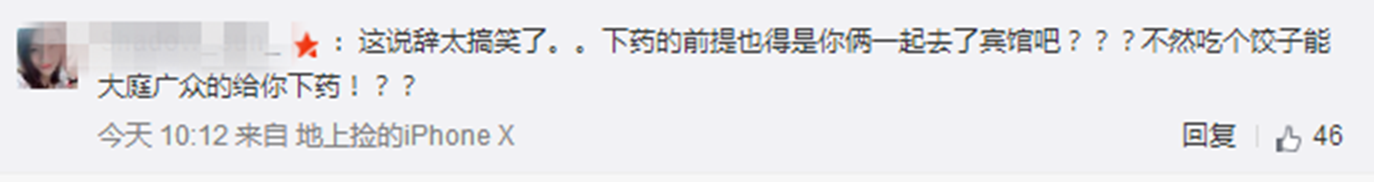 不过,不少网友对此也不相信,说:这个说辞太搞笑了,下药的前提也得是你两一起去了宾馆吧?不然吃个饺子都能在大庭广众的给你下药???