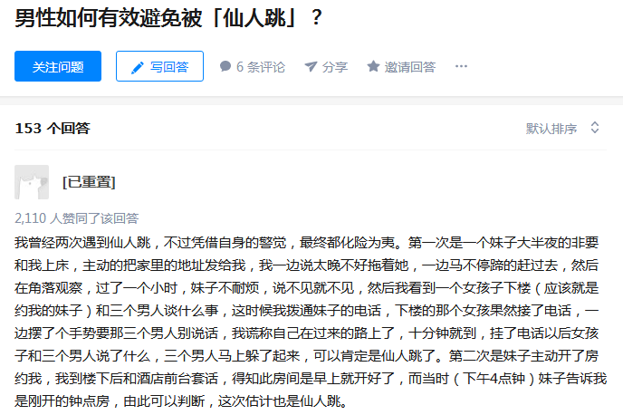 嗯,这位网友说的也是实情,相信有不少男士遇到过仙人跳,而且,某乎上也有针对仙人跳的讨论!但尽管仙人跳事件不少,也并不是每每都有男性中招,关键是要看自己能不能把握住欲望,否则就是引火烧身破财挡灾了。