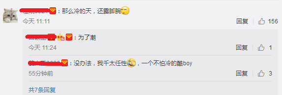 最后粉丝还是在不断的调侃偶像:没办法,我千太任性,一个不怕冷的酷boy~~看得出,粉丝虽然心疼,但也是满满的关怀了。