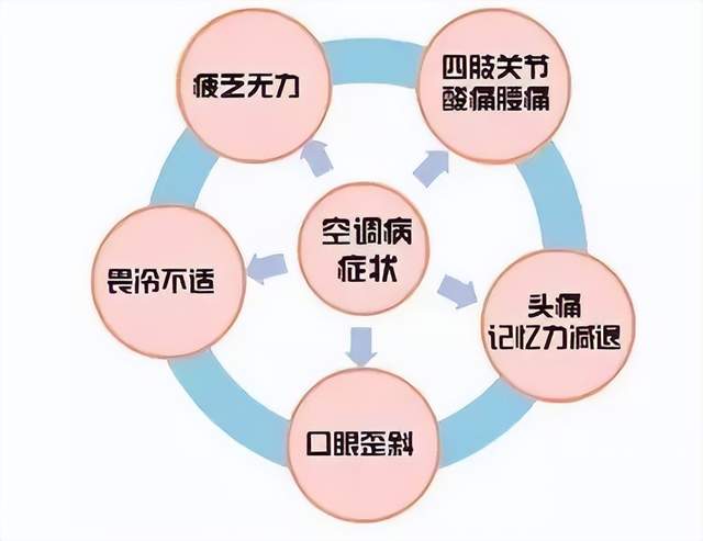 比如鼻塞、流鼻涕、喉咙干痒、关节酸痛以及头晕、头痛、食欲不振、全身乏力等症状,也就是大家所说的空调病。