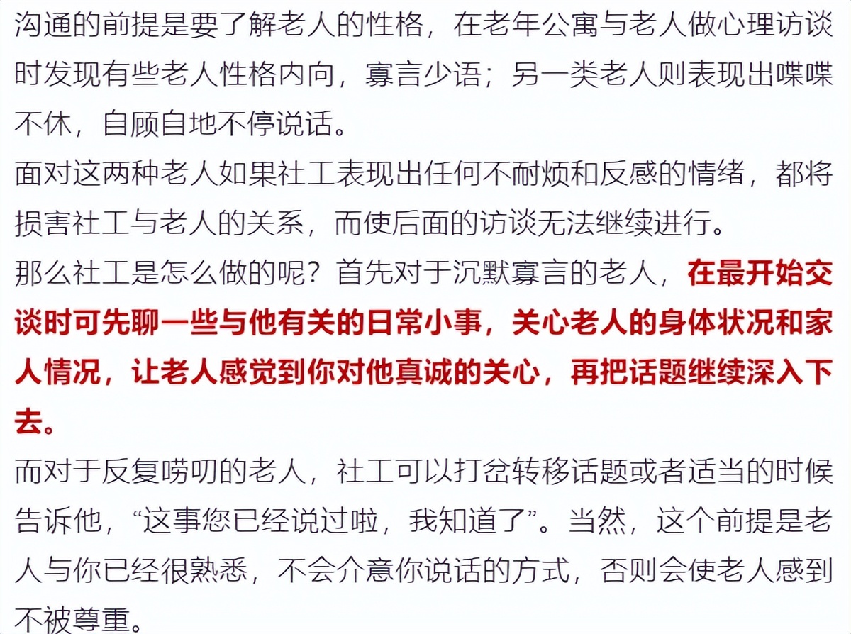 这就考验社工的耐心和专业度,社工与老人沟通需要持有不批判的态度,了解他们的真实感受,并对他们的感受做出积极的反应,老人从这种回应中得到安慰,使他们不再感到孤单,营造一个让老人自由倾诉的环境,才能与老人建立信赖的关系。