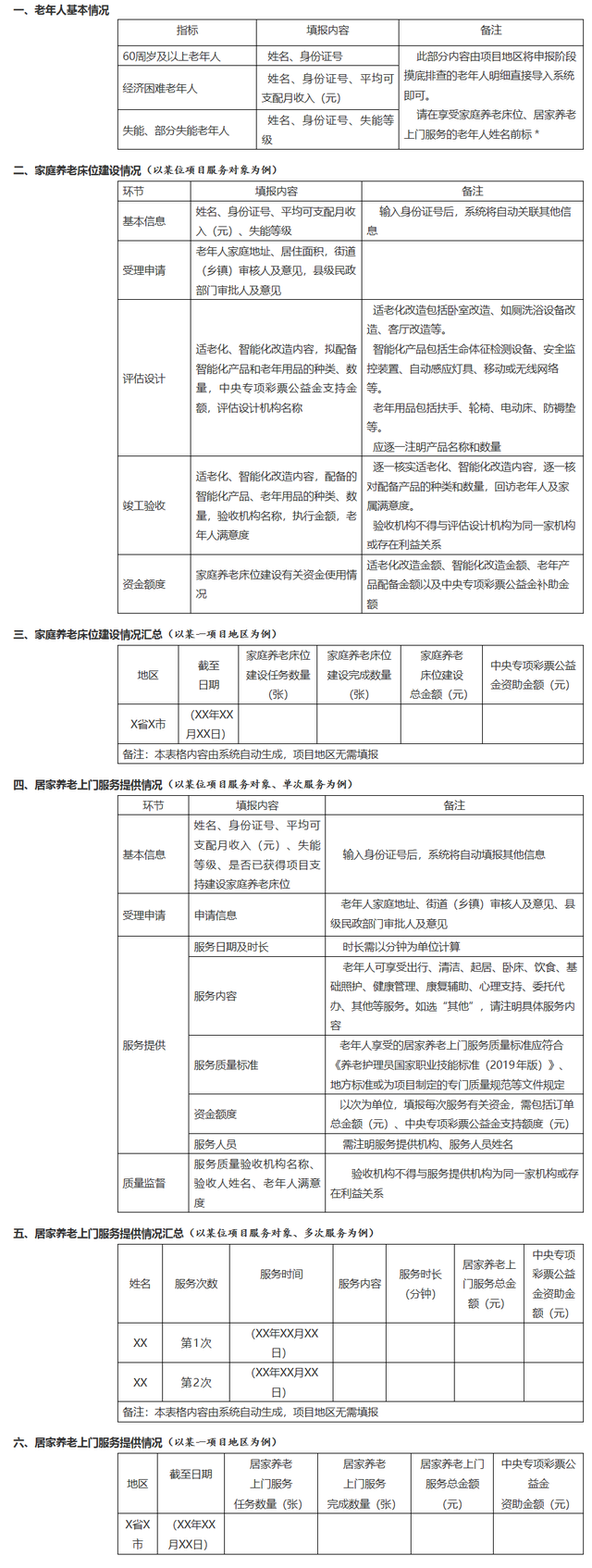 (二)建立工作台账。各省级民政部门要会同财政部门指导项目地区严格按照《通知》关于老年人口统计口径、经济困难和失能等级认定标准等要求,认真审核确认符合条件的老年人,建立服务对象工作台账,以能力综合评估结果为基础,尊重老年人意愿,按照“一人一案”原则,列明每位老年人基本信息、建设家庭养老床位或提供居家养老上门服务具体内容、进度安排、提供主体、完成情况、满意度评价等。要责成项目地区安排专人负责将服务对象工作台账信息录入“金民工程”全国养老服务信息系统“居家和社区基本养老服务提升行动项目”版块(见附件2),并及时根据工作进度补充更新。