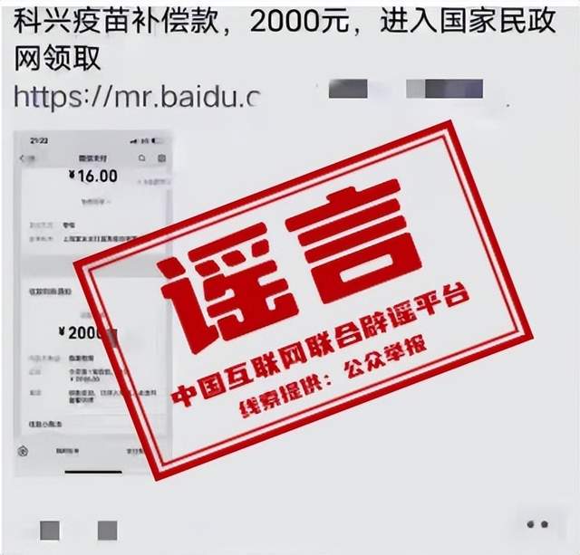 近日,有网帖称“接种新冠疫苗可在国家民政网站领取补偿”,并附网址链接和收款通知,以此诱导人们关注转发。