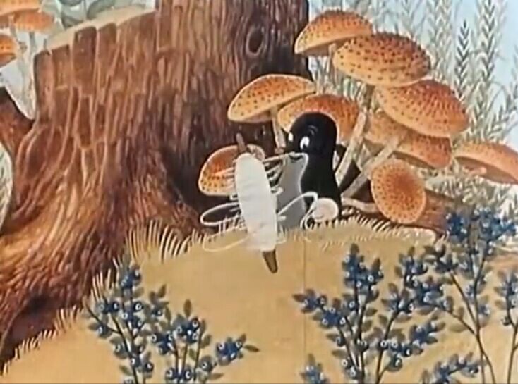 之后鼹鼠让白鹳帮忙压轧,找到刺猬将亚麻变成亚麻纤维,让蜘蛛把纤维纺成纱,再把纱染色。染色的过程非常有创意,鼹鼠把纤维缠在木棍上使其滚入蓝莓树丛。这里的蓝莓不是我们在超市能买到的原产北美的蓝莓品种,而是食用历史最久远的原产欧洲的黑果越橘(Vaccinium myrtillus)。黑果越橘是典型的林下小灌木,常常成片生长,在中国也是仅新疆有分布。蓝莓的后方是豹斑鹅膏菌(Amanita pantherina),它有个著名的亲戚毒蝇鹅膏菌(Amanita muscaria),这两种蘑菇都有剧毒,食用会使人产生幻觉。