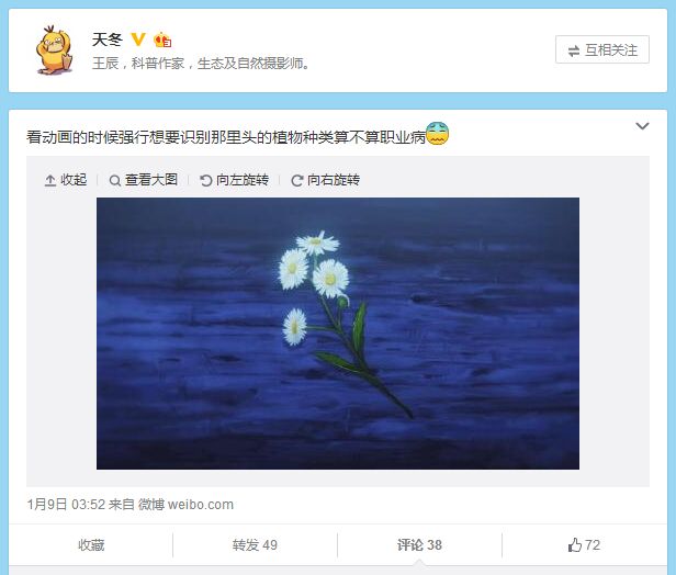 于是想起了童年那个时代(处于无数经典作品和喜羊羊交接的最后关头,好险)非常流行的动画《鼹鼠的故事》,这是我对真实植物在动画中露脸最早的印象,可惜影片里都是欧洲常见的种类不是很面熟。不过一提到鼹鼠的故事,很多人都会对鼹鼠用来做裤子的蓝色五瓣小花有记忆,这可能是我们对植物最开始的了解,也将会影响我们长大之后对于植物甚至其它生物的态度。