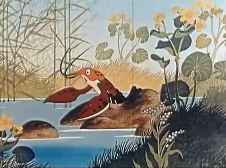 鼹鼠在追蝴蝶的时候落水,小龙虾(哦不对,是某种欧洲螯虾)爬出来抗议。螯虾旁边是几种常见的湿地植物,蓝色的小花是沼泽勿忘草(Myosotis scorpioides),中国湿地常见的是另一种湿地勿忘草(Myosotis caespitosa),而栽培观赏的勿忘我(forget-me-not)又是另一种森林勿忘草(Myosotis sylvatica)。黄色的大花是驴蹄草(Caltha palustris),在北半球寒带、温带和高山地区广布,中国东北和西南高山的湿地很常见,它们都不是挺水植物,只是生活在水边湿地中。