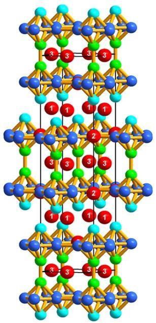 最终,他们真的成功地得到了一种BaZnGa结合在一起的晶体!它的结构如下图所示,其中红色的球代表钡,其他绿色,青色和蓝色的位置可以被锌和镓占据。
