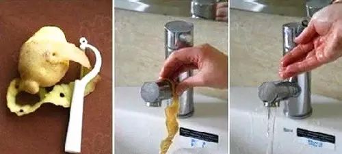 用土豆削下的皮,贴着肉的那一面擦拭,马上恢复闪亮!