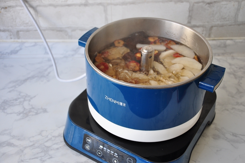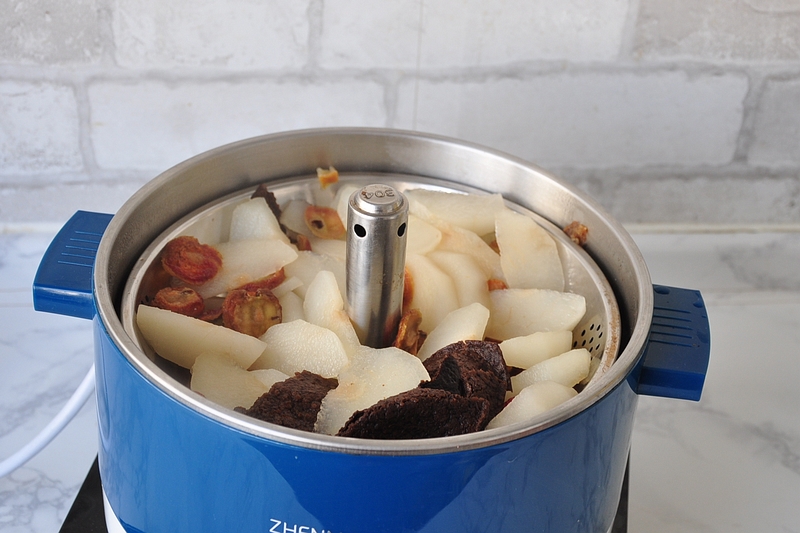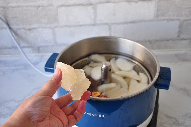 3将锅中加入适量的水,然后将蒸格放入,沉入锅中,然后放冰糖。我用的是臻米升降电火锅,它带有升降功能,可以将蒸格可以沉入水中,用时升出,拿取非常的方便。如果您用普通的煮锅,那就直接将食放入,水没过食材1厘米左右就可以了。