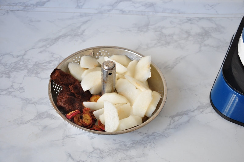 6接下来,用电火锅的升键将蒸笼升起,将梨块单独挑出即可,山楂干和陈皮就不要了。