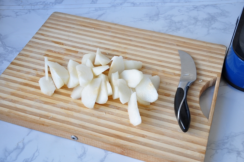 1将梨去皮去核切成片。或者块状,您喜欢就好,薄一点的片更容易煮熟。