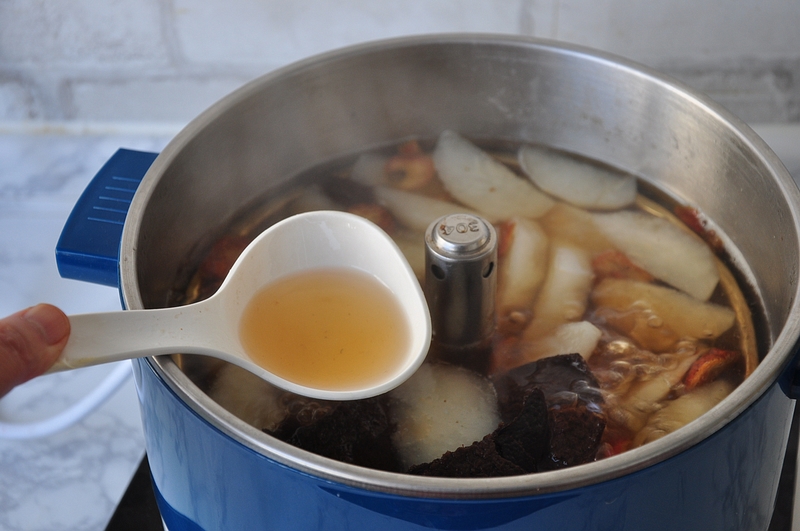 4大火煮开后转小火慢煮,这时可以看到汤汁慢慢变色了。陈皮的色泽已经开始渗入汤汁中。