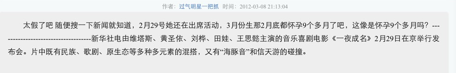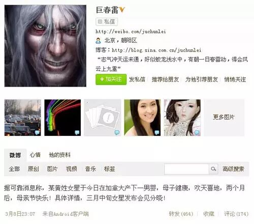 2012年3月8日巨春雷爆料说黄圣依产下一个男孩。