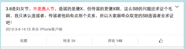 后面索性在微博爆粗口,说今天是妇女节不是愚人节,传谣的是sb,这么傻逼的问题求证毛啊。我只承认造谣者,传谣者他妈有点那个关系,所以大家跟哗众取宠的ab造谣者去求证吧。
