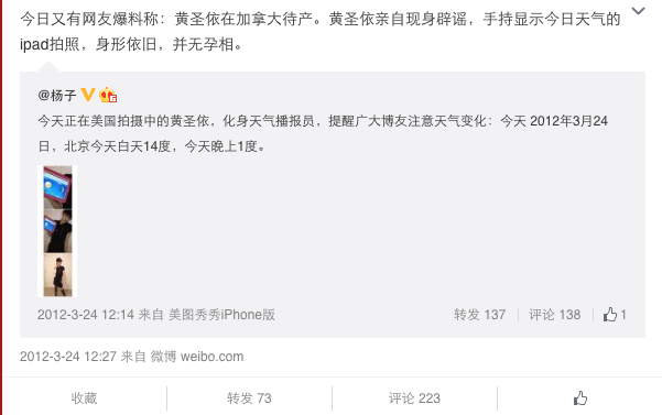 当年的微博环境简单,没有那么多娱乐号,也很好操控,所以非常顺利的和谐了微博上与黄圣依怀孕有关的所有话题。