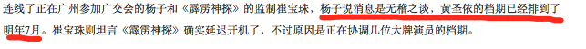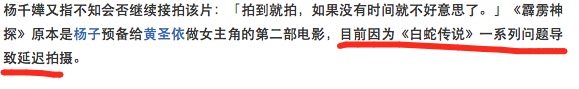 最终的结果是《霹雳神探》延期拍摄,一方面因为杨千嬅怀孕,另一方面则是黄圣依怀孕,但是官方的回答是《白蛇》出了问题。
