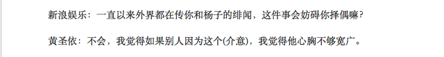 去年新浪采访黄圣依,问一直以来你跟杨子都有绯闻,这会影响你择偶吗?黄圣依非常煞有介事回答:不会影响,如果别人因为这个介意,我觉得心胸不够宽广。。。。。。(没心没肺跟心胸宽广一步之遥)