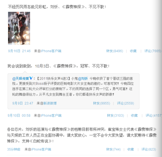 11年刘忻无疑是人气王,为了拉拢刘忻粉丝,杨子在微博上时不时送福利,一会夸刘忻会拿冠军,一会给刘忻下片约,还不忘让刘忻粉丝去电影院看跟刘忻没有一毛钱关系的《白蛇》。
