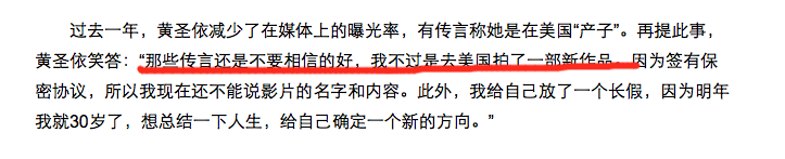 再看看黄圣依是怎么回应生子一事的吧。黄圣依说她是去美国拍摄了电影,但是因为保密协议不能公布影片的名字。