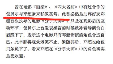 后来邓超离开华谊转头光线传媒,而包贝尔正是光线的签约艺人,然后俩人又合作了《四大名捕》,去年邓超的《分手大师》包贝尔也帮着去宣传。