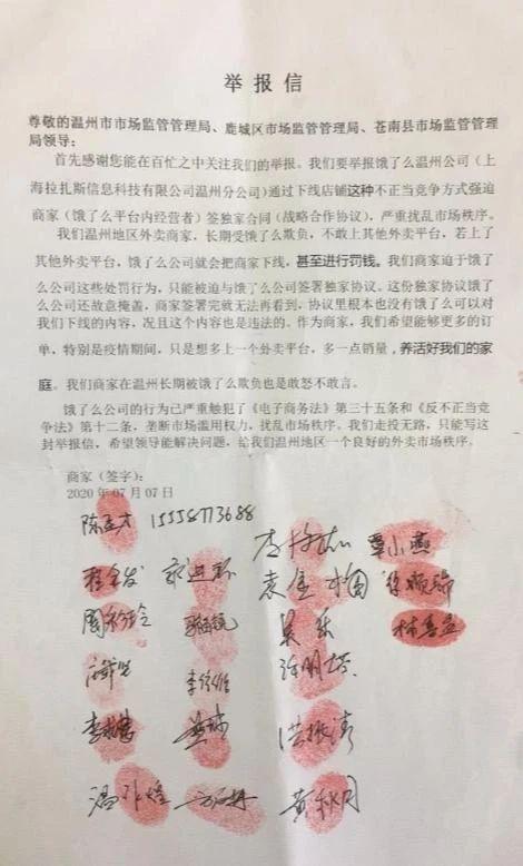 然而,仅过去一天,温州20名饿了么商家便联名对饿了么进行举报。据了解,今年7月,在浙江温州苍南县,由于没有同意签署独家协议而遭遇饿了么强制下线的20户商家联名向温州市市场监督管理局实名举报:饿了么采取强制下线店铺的不正当竞争行为,逼迫广大中小餐饮经营户二选一,严重扰乱市场秩序。