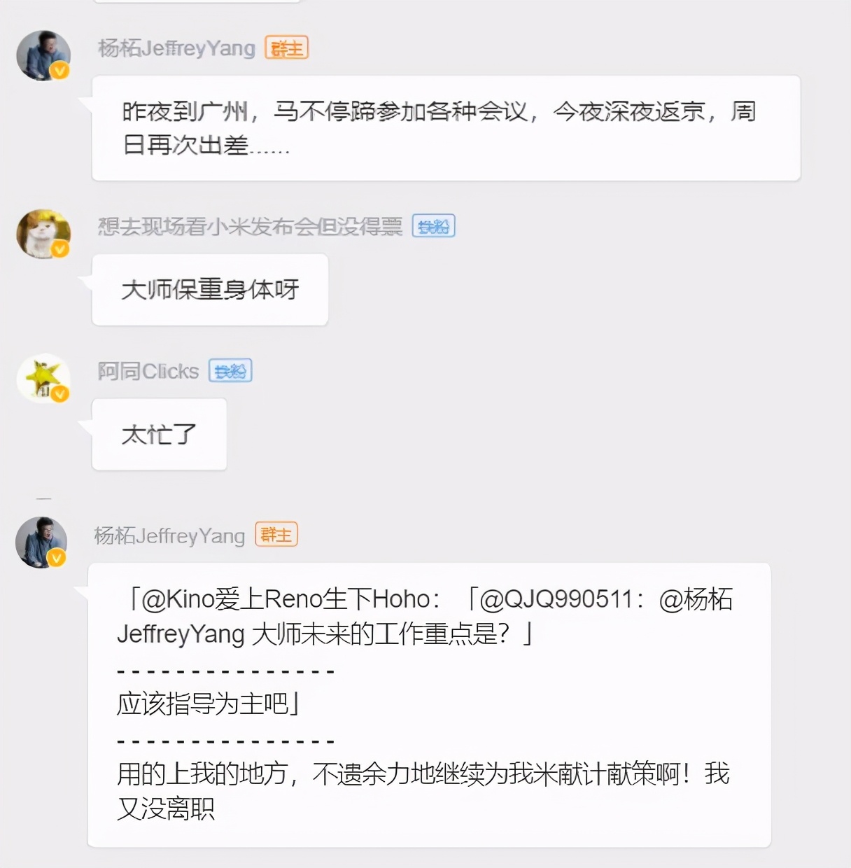 此外,杨柘本人也在粉丝群中表示,自己的行程非常繁忙,“昨夜到广州,马不停蹄地参加各种会议,今夜深夜返京,周日再次出差……”我们都知道,身为小米这一科技巨头的高层管理者,工作繁忙是必然的。但当繁忙的工作与欠佳的身体同时堆在一起,可能让杨柘有些“力不从心”,调整岗位也是情理之中了,毕竟身体健康最为重要。