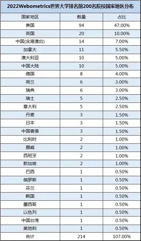 其次为英国20所,占10%;中国(含港台地区高校)上榜14所,占7%;加拿大11所,占5.5%;澳大利亚10所,占5%。