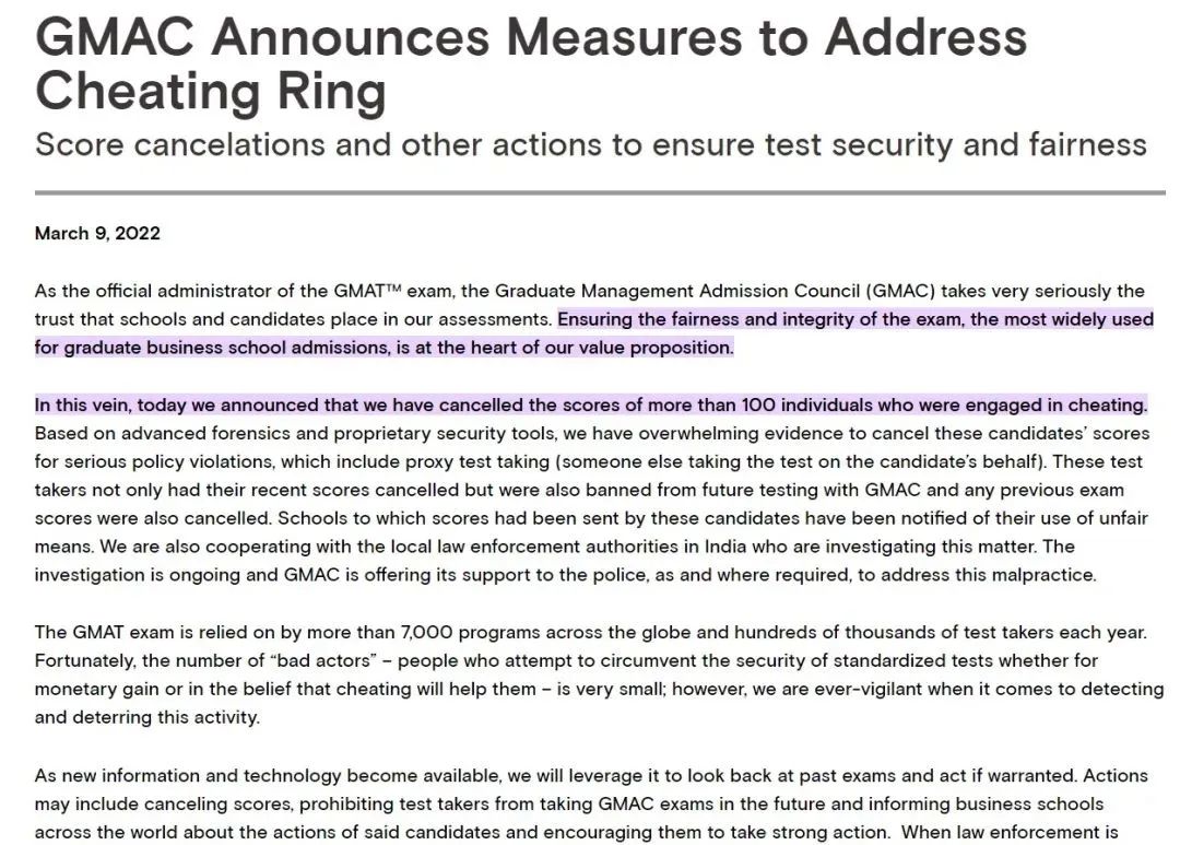 GMAC指出,他们有充分确凿的证据证实一些考生严重违反考试规则,对相关考生处以取消成绩、终身禁考、通知全球商学院相关考生的作弊行为并督促他们采取严厉的措施。