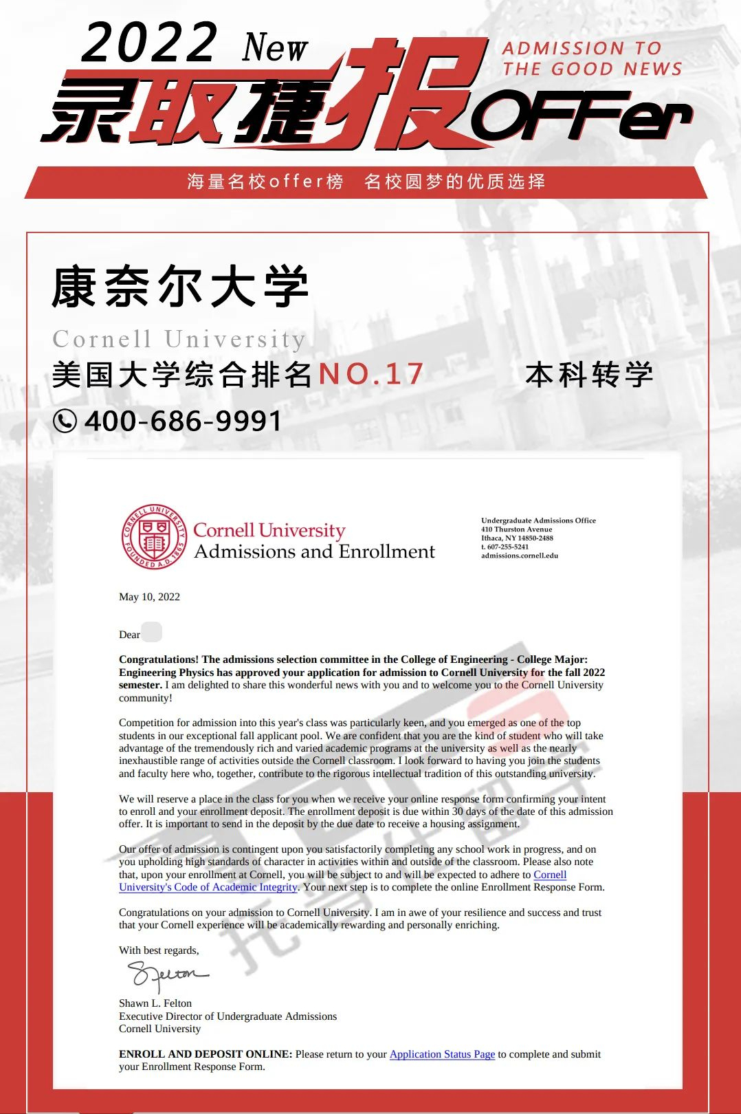 而今日的录取更为重磅,本转冲藤——康奈尔大学本科转学录取抵达。